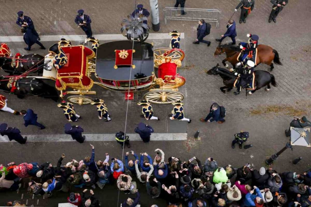 Vanaf het terras aan het Lange Voorhout was er een uniek uitzicht op de Glazen Koets, die onder begeleiding van een militair ere-escorte voorbijtrok richting de Koninklijke Schouwburg. Daar sprak Zijne Majesteit de Koning de Troonrede. De toespraak was live te volgen op grote schermen in de Kloosterkerk.